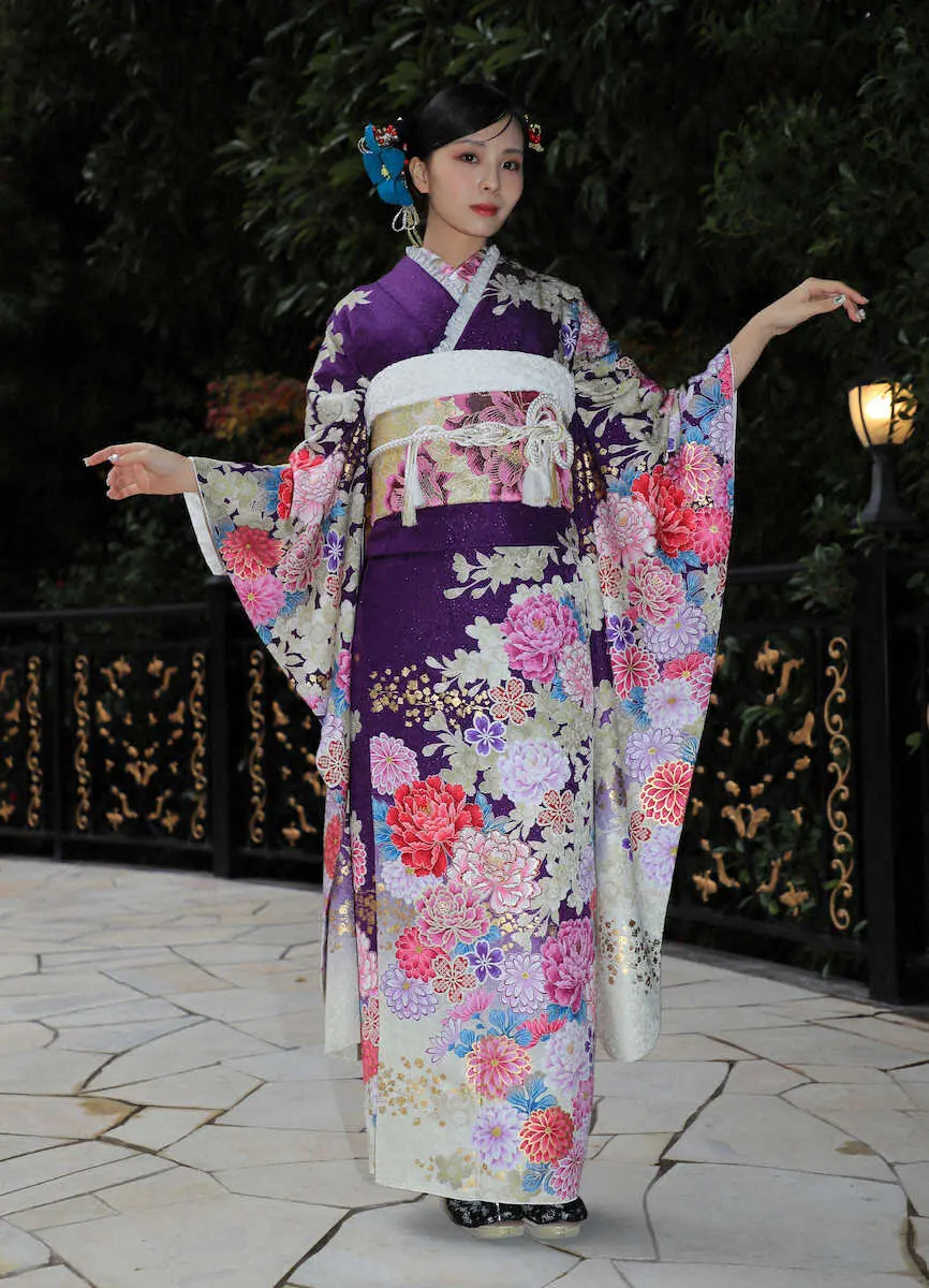 晴れ着姿でポーズする川口ゆりな(撮影・篠原岳夫)