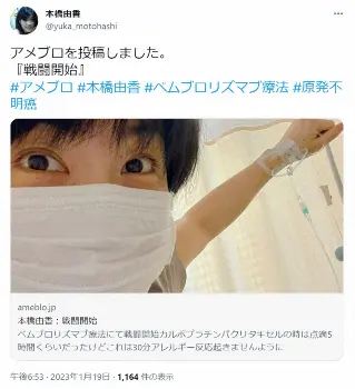19日には「戦闘開始」のタイトルで投稿。「ペムブロリズマブ療法にて戦闘開始!!カルボプラチンパクリタキセルの時は点滴5時間くらいだったけど これは30分 アレルギー反応起きませんように」と実際の治療を開始したことを報告。その後、「無事クリア」のタイトルで更新。今回の治療法で考えられる主な副作用として「消化管障害、皮膚症状、甲状腺機能障害、副腎障害、1型糖尿病、重症筋無力症・心筋炎・筋炎・横紋筋融解症、神経障害、肝障害、腎障害、心臓障害、免疫性血小板減少性紫斑病脳炎、静脈血栓塞栓症 脳炎、静脈血栓塞栓症」が挙がっていたといい、「発現率はそんなに高くないようですが なかなかですな」と本橋。それでも「ひとまずアレルギー反応も起きず 無事クリア」と第一難関は無事にクリアしたといい、「次回からは外来で治療予定 ご褒美スタバ」とスターバックスのカップを持つ最新ショットを投稿した。