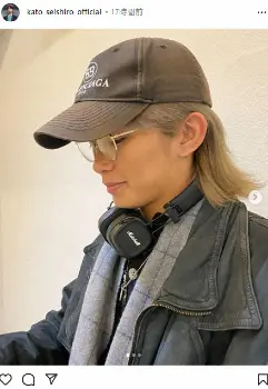 「メガネ新調しました!!!!実は外で掛ける度付き眼鏡が、ここ1年以上無くってですね、、嬉しい…細めの金縁に細いインナーの黒縁 そして多角形。お買い物で久しぶりにビビッときました!そして新しいメガネはテンションがアガる!!よし、これでしばらくは自分の機嫌を取れそうだ。笑笑」と金髪ロン毛、メガネ、キャップにヘッドホンを首にかけたショットをアップした。
