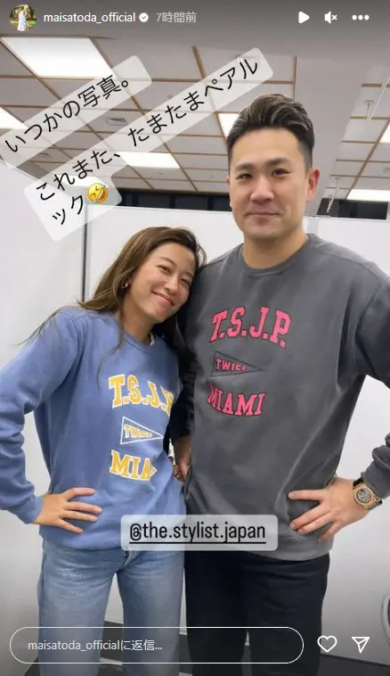 楽天・田中将大投手(34)の妻でタレントの里田まい(38)が20日に自身のインスタグラムのストーリーズを更新。田中とのペアルックを公開した。