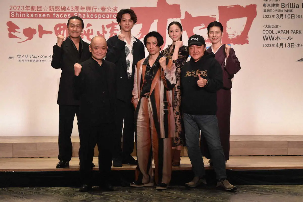 舞台「ミナト町純情オセロ」製作発表に出席した(前列左から)青木豪氏、三宅健、いのうえひでのり氏(後列同)粟根まこと、寺西拓人、松井玲奈、高田聖子(撮影・糸賀日向子)