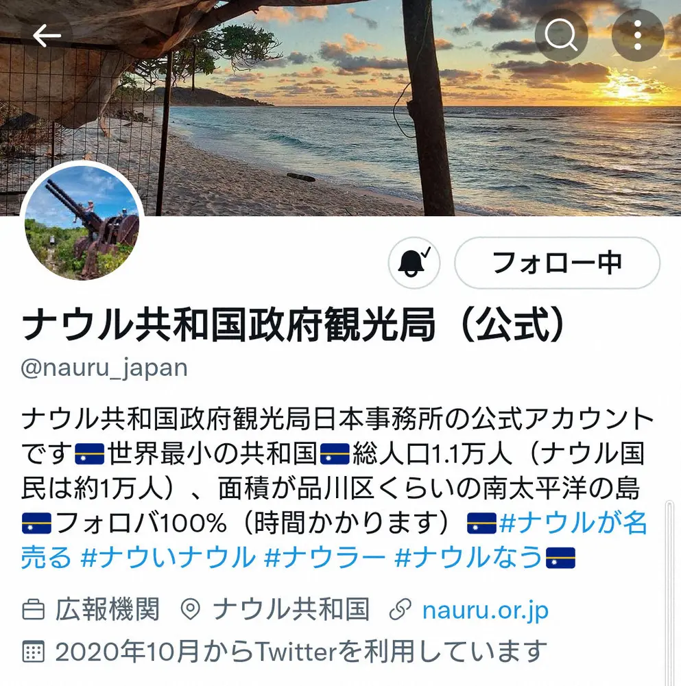 ナウルは豪州・シドニーの北北東約4000キロ、太平洋南西部に位置する島国。人口約1万1000人と世界最小の共和国ながら、観光局公式ツイッターは43万人超のフォロワーを誇る。