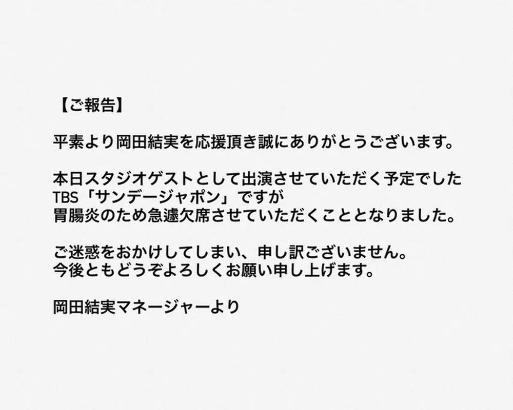 岡田結実 Photo by スポニチ 岡田結実 胃腸炎でサンジャポ欠席 母佑佳も年始に入院報告「お大事に」… ギャラリーで見る この記事のフォト 2023年01月22日の画像一覧 もっと見る 2023年01月22日の画像をもっと見る