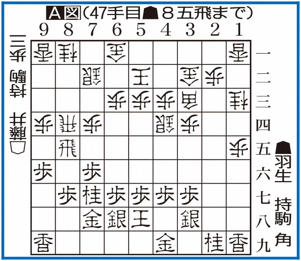 藤井が82分の長考で△3三角と局面の収束を図っても攻め足は止まらない。▲8五飛(A図)と、飛車の大転回を決行し、一気に激しい戦いに突入した。