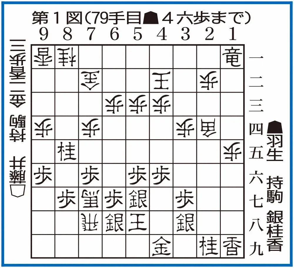 藤井から猛攻を受け続けた最終盤はさらに、しびれる手順を見せた。左から馬と飛車、右から角がにらみつける挟撃態勢を甘受して絶体絶命になった場面の79手目▲4六歩=第1図。右辺への脱出口を開いて細長い逃げ道をがっちり確保した。「銀とか使って受ければ(以降)長い勝負になってしまう。ちょっと分が悪そうなので歩を突いて勝負しました」――実はその銀を6九に受けると大逆転される筋が生じていたというのだから恐ろしい。巧妙にワナを仕掛けたはずの藤井は、この一手を見てガクッと頭を下げた。