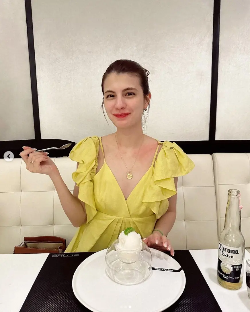「一年中、夏の国に住みたい。切実」とつづり、胸元、背中ともに大きく開いた黄色のドレス姿の写真をアップした。