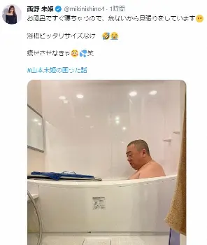 元AKB48のタレント・西野未姫(23)が24日、自身のツイッターを更新。夫でお笑いコンビ「極楽とんぼ」山本圭壱(54)との日常が反響を呼んでいる。