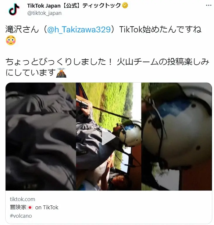 このアカウントには「本物!?」と真偽を問う声が多く上がっていたが、TikTok公式ツイッターが「滝沢さんTikTok始めたんですね ちょっとびっくりしました!火山チームの投稿楽しみにしています」と投稿。この投稿に対し、滝沢氏が「お世話になりまーす」と返信したことから、本人のアカウントであることが確定した。また、自身のツイッターにも「【冒険家】TikのTok始めましたー冷やし中華始めました!みたいになっちゃった こちらです。テキトーにやります!(飽きなければ)」と紹介した。