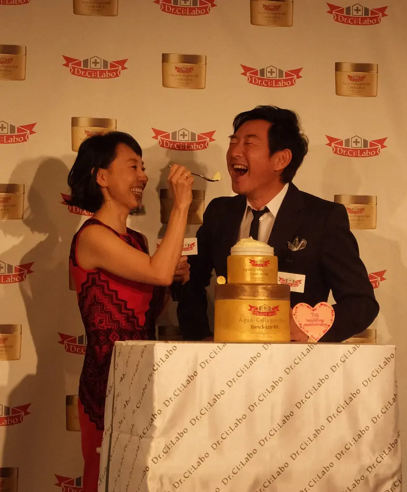 結婚記念日を迎え、妻でプロゴルファーの東尾理子にケーキを食べさせてもらう俳優の石田純一(2016年撮影)