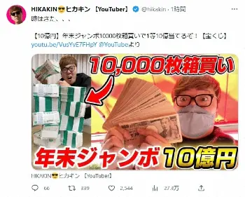 12月30日にアップした動画で、巨大な段ボールを見せたヒカキン。そこには10000枚の年末ジャンボ宝くじ(300万円分)が封入されており「これだけありゃ、絶対10億円当たるだろ!」「うわ~、やってることアラブの石油王だ」「うお~外れる気がしね~」とテンションマックスで紹介していた。