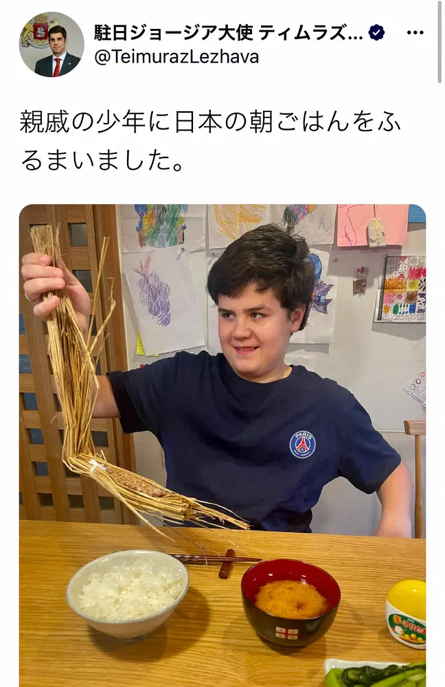 ジョージアのティムラズ・レジャバ駐日大使(34)が27日、自身のツイッターを更新。「来日中の親戚の少年」シリーズとして、日本の朝ご飯を紹介したものの「食べたことない」「ハードル高い」という声が相次ぎ、話題を集めた。