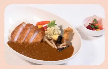 羽生の「能登豚カツカレー」はもちもちとした肉質と口の中でじわっと溶ける脂のバランスが特徴。地元野菜のピクルスがアクセントとなっている。