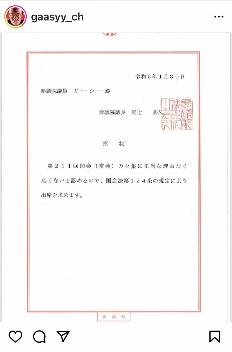 「ガーシー」として知られるNHK党の参院議員・東谷義和氏(51)が30日、自身のインスタグラムを更新。自身に届いた「招状」を公開した。