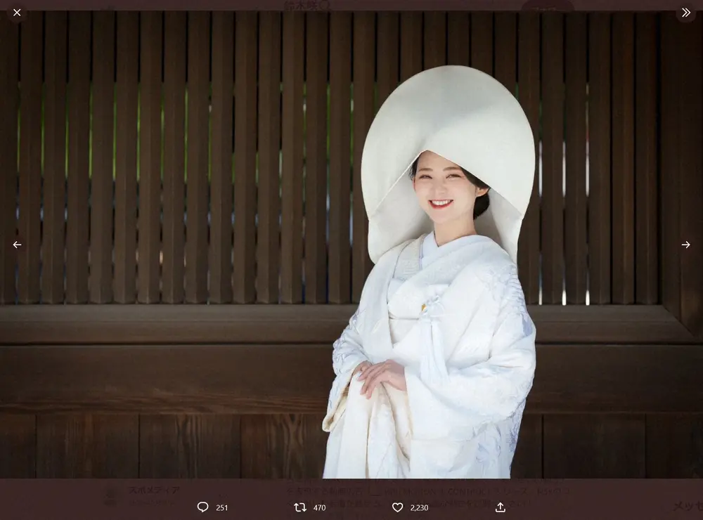 また「今後も仕事は続け、1人の人間として成長していけるよう精進してまいりますのでご指導ご鞭撻の程何卒よろしくお願い申し上げます。最後に、皆様のご健康とご多幸を心よりお祈り申し上げます」とつづり、白無垢姿やウエディングドレス姿の写真を添えた。