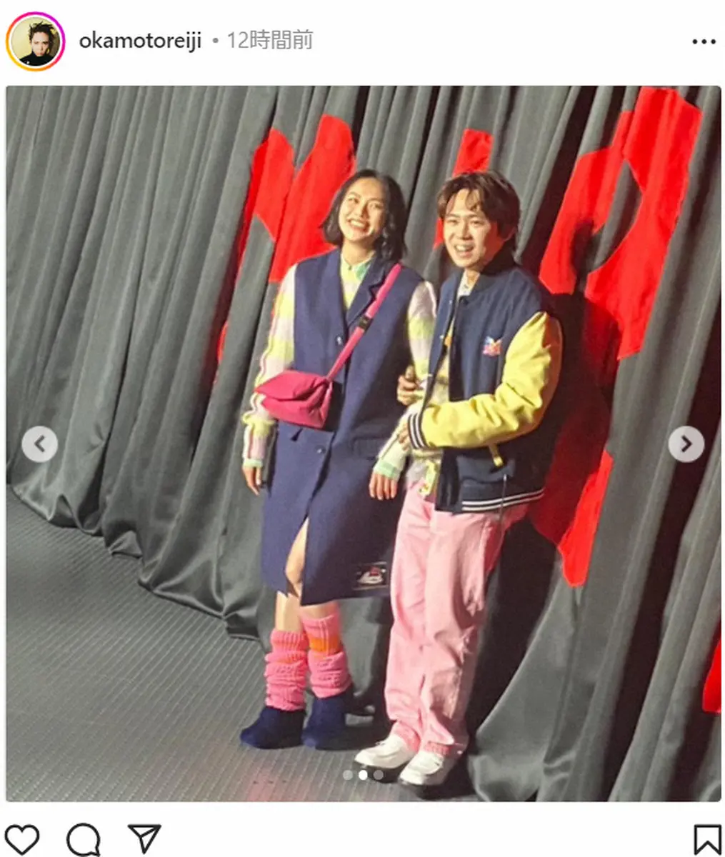 オカモトは、身に着けた衣装のブランド、マルニのアカウントと臼田のアカウントを「タグ付け」。臼田とは腕を組み、仲良さげに笑顔を見せた。