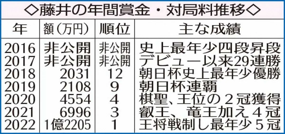 ☆将棋棋士2022年獲得賞金・対局料10傑☆ Photo by スポニチ 藤井王将 初の賞金王 また勲章…自身初1億円超え 渡辺名人は2位に後退 ギャラリーで見る この記事のフォト 2023年02月04日の画像一覧 もっと見る 2023年02月04日の画像をもっと見る