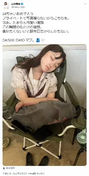 インスタグラムのストーリーでも同じ写真とともに「このとんでもなく可愛い寝顔 誰にも見せたくなかったけど 誕生日だから仕方ない 24ちゃいおめでとう 「DAISUKI DAYO マブ」との言葉を添えた。