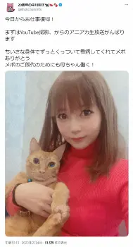 2日午前、愛猫とのショットとともに「今日からお仕事復帰!」と仕事復帰を報告。「まずはYouTube撮影、からのアニアカ生放送がんばります ちいさな身体でずっとくっついて看病してくれてメポありがとう メポのご飯代のためにも母ちゃん働く!」とつづった。