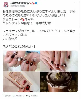 その後の投稿で「お仕事復帰第一弾 アニソンアカデミー生放送が14時から!生放送がんばります スマホからは らじるらじるできけるよ!アニソンをフルサイズで流しまくります」とつづり、さらに「お仕事復帰のために久しぶりにネイルしました!手術のために取らなきゃいけなかったから嬉しい!チョコレートネイル バレンタイン関係なく一年中大好き フェルナンダのチョコレートのハンドクリームと香水にハマっているよ いいかおり スタバのこれのみたい!」と最新ネイルの写真も披露した。