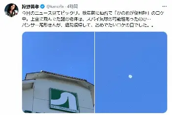 ちなみに狩野は「パンサー尾形さんが、退院復帰して、おめでたいロケの日でした。。」などともつづり、2020年のものだとしっかり記憶。確かに、2020年6月17日に、仙台上空で不思議な白い球体のものが飛来し、騒動になっている。