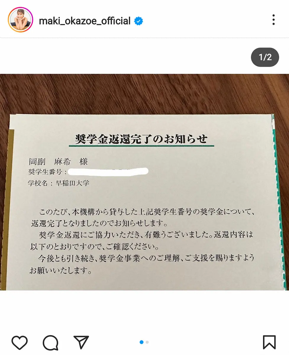 岡副麻希公式インスタグラム(@maki_okazoe_official)から 岡副麻希 早大時代の奨学金返済完了で「じーんときた」 フォロワー拍手… ギャラリーで見る この記事のフォト 2023年02月08日の画像一覧 もっと見る 2023年02月08日の画像をもっと見る