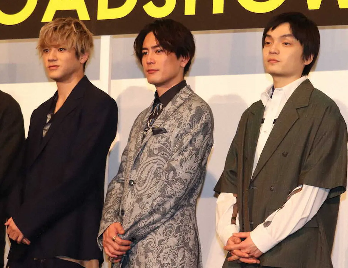 アニメ映画「BLUE GIANT」の完成披露試写会に出席した(左から)山田裕貴、間宮祥太朗、岡山天音