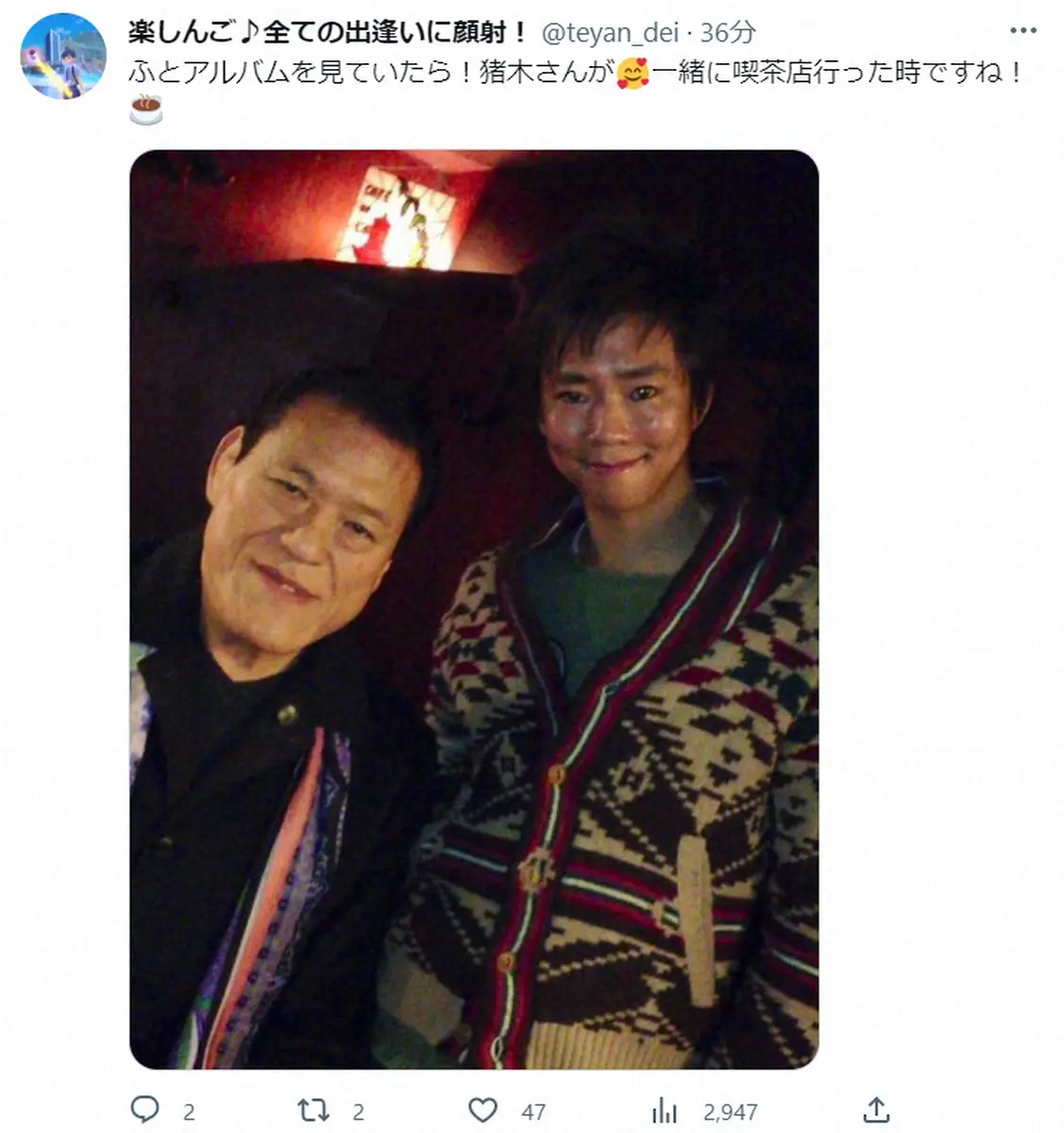 楽しんごは「ふとアルバムを見ていたら!猪木さんが」とつづり、猪木さんとの写真をアップ。「一緒に喫茶店行った時ですね!」とコメントした。