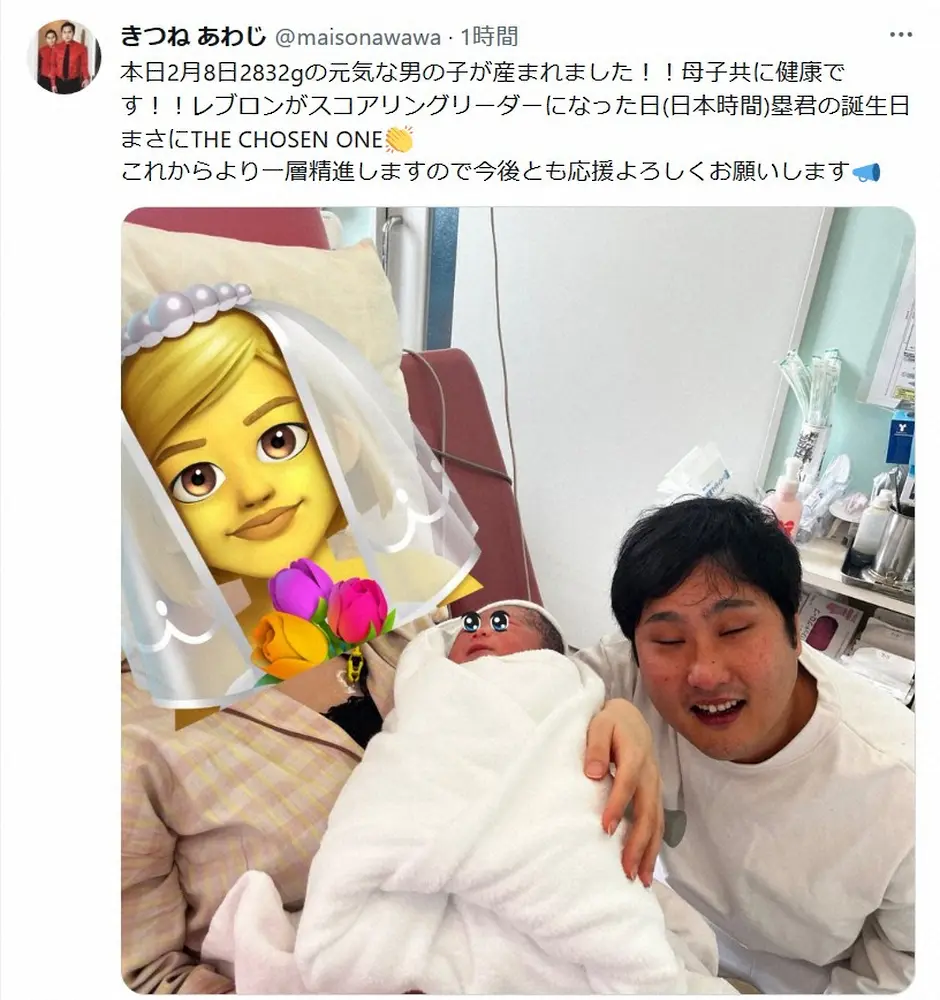 「本日2月8日2832gの元気な男の子が産まれました!!母子共に健康です!!」と報告。また「レブロンがスコアリングリーダーになった日(日本時間) 塁君の誕生日」とこの日はレイカーズのレブロン・ジェームズがNBA歴代最多得点記録を塗り替えた日であり、八村塁と同じ誕生日であると説明すると「まさにTHE CHOSEN ONE」と喜んだ。最後は「これからより一層精進しますので今後とも応援よろしくお願いします」と締めくくった。