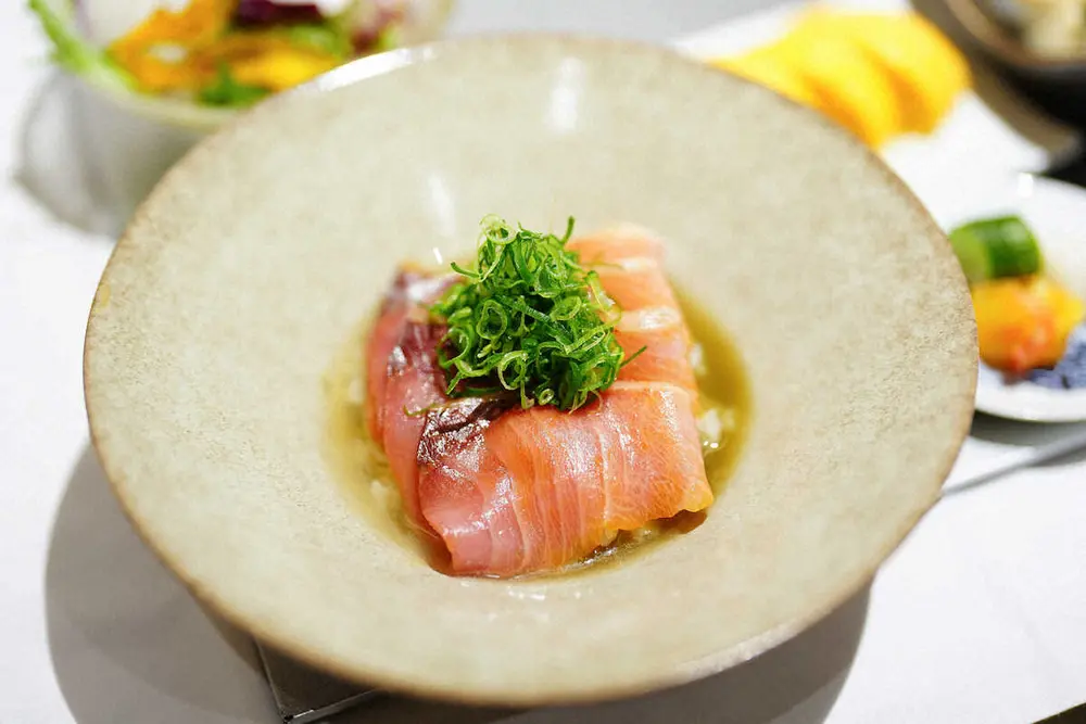 藤井がオーダーした「天然ブリの胡麻醤油漬けと東京狭山茶の出汁茶漬け 伊藤養鶏場の烏骨鶏卵を使った出汁巻」は、かつおと昆布のブレンドだしで抽出した狭山茶と、特製のつけダレを使った天然ブリとのバランスがマッチ。希少な烏骨鶏卵を使用しただし巻き卵も絶品。