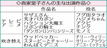 貴家さんはほかに、テレビアニメ「天才バカボン」のハジメちゃん、「ハクション大魔王」のアクビなど、愛らしい子供のキャラクターの声で人気を集めた。所属事務所によると、「サザエさん」のタラちゃんで「最も長くテレビアニメシリーズで同じ役を演じた声優として」2019年にギネス世界記録に認定された。