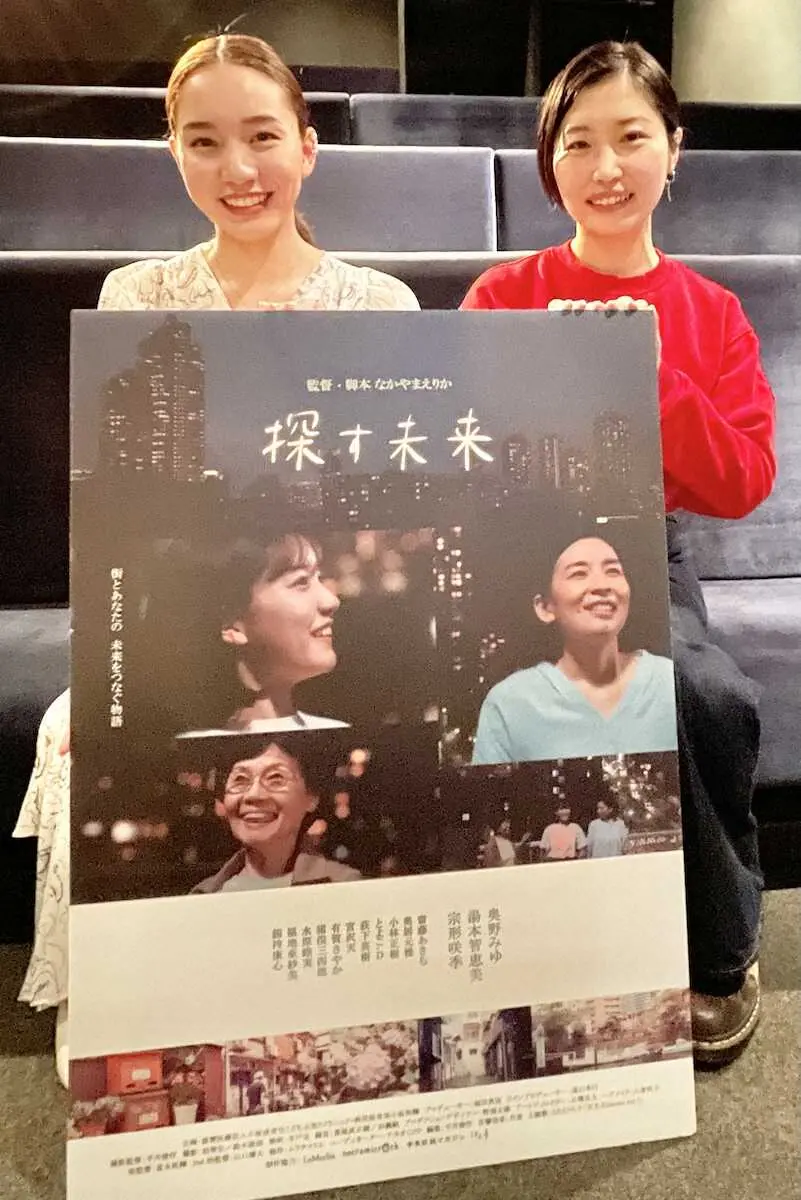 女優の奥野みゆ(19)が11日、都内で行われた、米ハリウッドで映画プロデューサーとして活躍中の福田真宙氏の制作した短編映画「探す未来」の試写会になかやまえりか監督(35)と出席した。