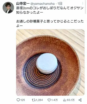 水を加えるとおしぼりとなる圧縮おしぼりで、フォロワーからも「どっからどう見ても砂糖菓子です」「素敵なお皿に乗ってるとお菓子にしか見えないですね」「デカいヨーグレットかと思いました」「これは難題過ぎますな」「入浴剤と間違えて家に持って帰りそう‥」「自分も和菓子かと思った」などの声が寄せられていた。