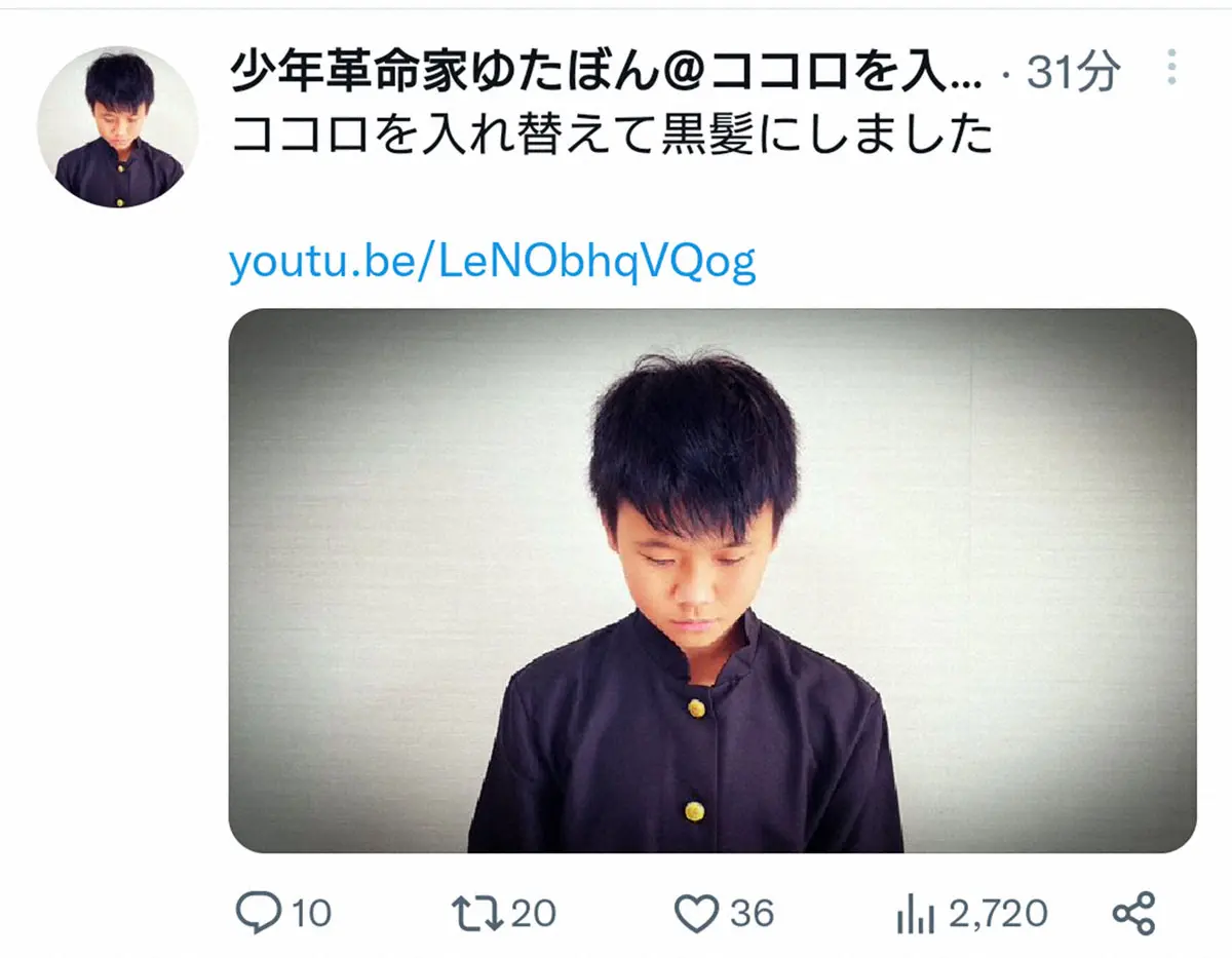 「少年革命家」を名乗る不登校ユーチューバーのゆたぼん(14)が13日、自身のYouTubeチャンネルを更新し、髪を黒く染める様子を披露した。