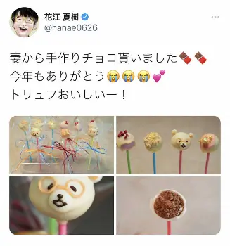 「妻から手作りチョコ貰いました 今年もありがとう トリュフおいしいー!」とつぶやき、チョコの画像を4枚投稿。カラフルなロリポップチョコで、中には花江そっくりのメガネをかけたクマも。「かわいすぎる」「素晴らしくおいしそう」「花くまさん可愛いですね」「圧巻のクオリティ」「店出せそう」などと、その完成度が話題を呼んでいる。