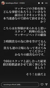 整体師として活動する楽しんごは、インスタグラムのストーリーズで「マッサージの予約を取り どんな事情であろうと!いきなり前日にドタキャンする方本当迷惑なので辞めて頂せませんか?」(原文ママ)と憤慨。「こちらはお客様が来られると思い スタッフ 料理の仕込み マッサージベッドの確保 3時間貴方の為に枠を空けてるんですよ 貴方も逆の立場になって考えてみてください!」と様々な準備をしていたにも関わらずキャンセルされて怒りがおさまらない様子。