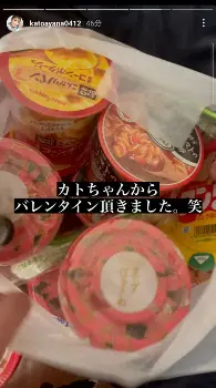 さらに「カトちゃんからバレンタイン頂きました。笑」とつづり、カップワンタンやカップスープが沢山詰められた袋を披露。「これは何ですか?」「これはあなたに、バレンタインの」「あ~、ダイエットめっちゃしよるのに…ありがとう!めっちゃバレンタインや~ ちょっとカロリー低め目なのも入っとる ありがとう」というほほえましいやりとりも披露していた。