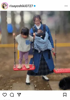 この投稿に、ファンからは「ほっこり」「なんかいい写真」「すごくかわいい」「親子貸切ブランコって素敵」「公園行くのにもめっちゃおしゃれな服装」「素敵なご家族です!」などのコメントが寄せられている。