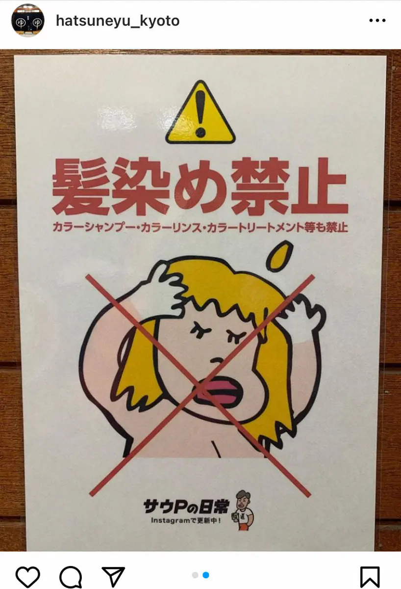 飲食店などでの客による迷惑行為が連日のようにSNSで発信され、大きな社会問題となっているが、今度は銭湯での迷惑行為。「ちなみに脱衣所入口や脱衣所内には貼ってるんですけどね」と「毛染め禁止」「髪染め禁止」と大きく書かれた注意喚起の掲示物の写真も公開したうえで「帰り際に再度注意したら、3人組の1人が『でもカラーシャンプーですから・・・』って言うてました。あかんわ、こいつら・・・」と続けた。