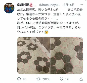 問題となっているのは京都市中京区の銭湯「初音湯」が14日に投稿した客の迷惑行為だ。「たぶん観光客、若い女子3人組・・・赤の毛染め敢行。常連さんが気づき、注意した後に洗い流してもらうも後の祭り・・・」として、タイルの目地が無残にも赤く染まってしまった写真を投稿。「最近、SNSで迷惑動画が話題になってますが、同レベルの話。こういう事、平気でやりよるんやなぁって感じです」とあきれたように続けた。