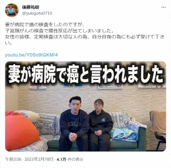 タレント・後藤真希(37)の弟で、アイドルグループ「EE JUMP」元メンバーのユウキこと後藤祐樹(36)が18日、自身のSNSを更新。妻の千鶴さんが子宮頸がんの疑いがあることを明かした。