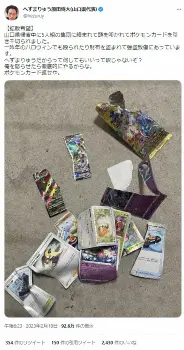 へずまは「山口県帰省中に5人組の集団に絡まれて頭を叩かれてポケモンカードを引き千切られました」とつづり、破れたり折れたりしているカードの写真をアップ。「一昨年のハロウィンでも殴られたり財布を盗まれて強盗致傷にあっています。へずまりゅうだからって何してもいいって訳じゃないぞ?俺を怒らせたら徹底的にやるからな。ポケモンカード返せや」とつづった。