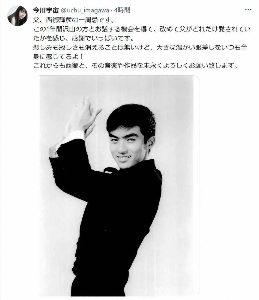 昨年2月に75歳で死去した歌手の西郷輝彦さんの三女で女優の今川宇宙(26)が20日、自身のツイッターを更新。西郷さんの一周忌を迎えたことを報告した。