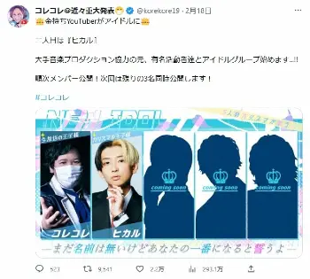 コレコレは「100キロ越えのおっさんがアイドルに 大手音楽プロダクション協力の元、有名活動者達とアイドルグループ始めます...!!」と5人組のグループを結成したことを報告。そして「金持ちYouTuberがアイドルに 2人目は『ヒカル』次回は残りの3名同時公開します!」と驚きの発表をした。