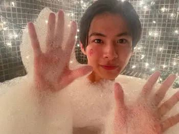 物語では、人生に希望をなくした主演・犬田光役の小宮璃央さんが、宇宙美空役の新條由芽さんと泡風呂に入る緊迫したシーンでしたが、カメラを向けると、まさに“犬”のような可愛い笑顔をみせてくれた小宮さん。泡風呂初体験の新條由芽さんとともに大量の泡に楽しげな様子でした。ほっこり!