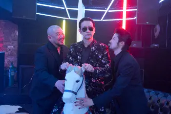 飯田基祐さん(写真中央)、をボスとする黒の組織の一枚。闇のクラブ「G-アンツ」のセットに置かれていた、木馬に興味をもった、イケオジ3人組。作品内では強面の3人も、撮影の合間に仲よく遊んでいる姿にほっこり!
