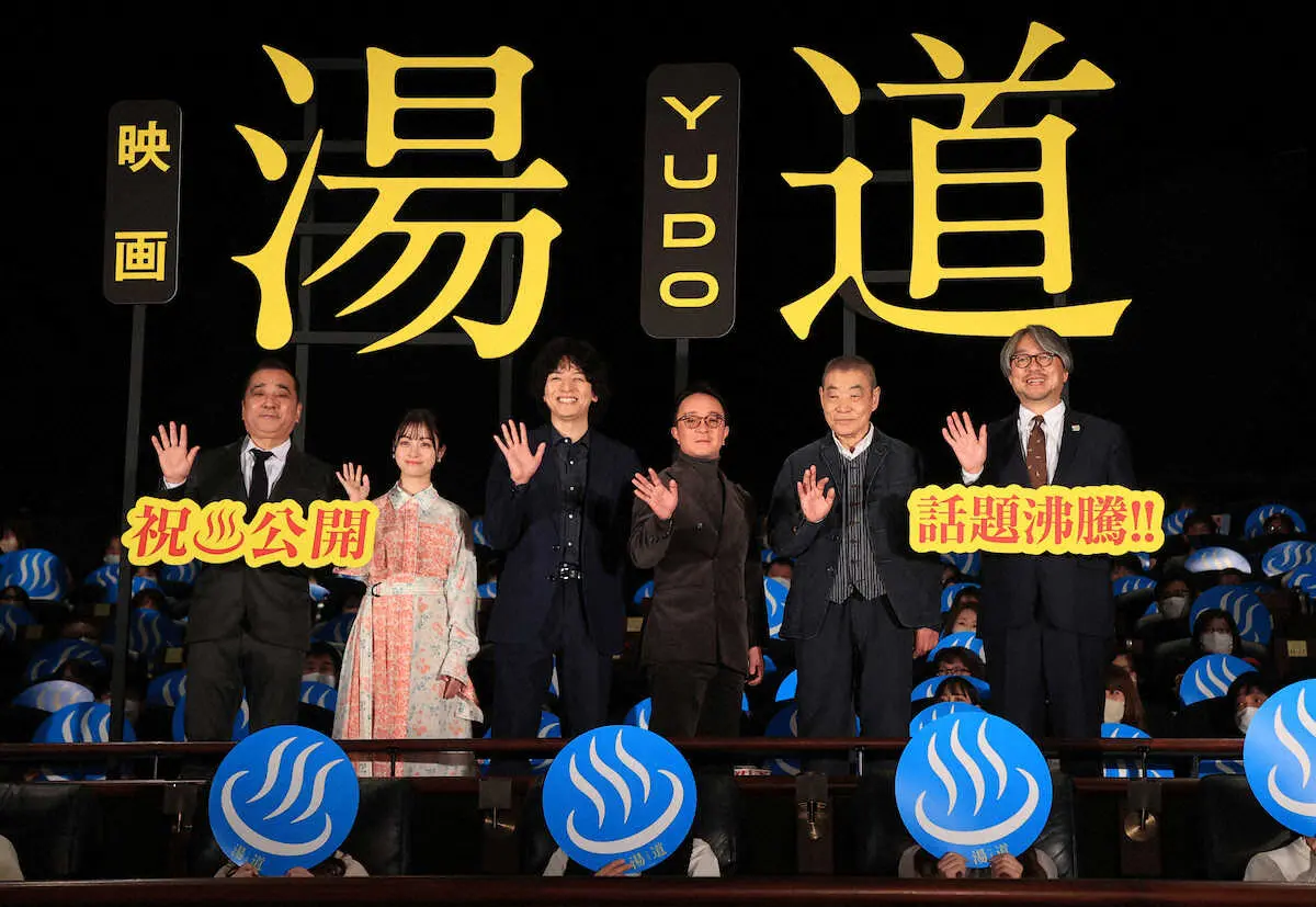 舞台となる古びた銭湯を巡り、さまざまな人間模様を描く物語。クランクアップが2021年12月のクランクアップから一年以上たっての初日。「ひとっ風呂浴びたようなさわやかな笑顔を見ることができてすごく幸せです」と風呂にかけて喜びを語った。