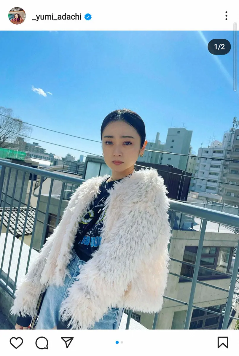 足立はTシャツとデニムに白いファージャケットのカジュアルなコーデで「ある日のこと。この日は、スタッフとして撮影に参加」とつづり、その後フォロワーからの「何のスタッフさんで参加ですか」との質問に「スタッフとはいえ、特に何も出来ない差し入れおばちゃんでした」と答えた。