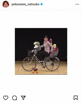 「何年か前にやっていたママチャリのお母さんのネタがリアルになる日が来そうで嬉しいです」とし「ちなみにこのママチャリの乗り方はいくつもの違反がありますので、絶対だめです」とネタで自転車に乗っている写真を投稿した。