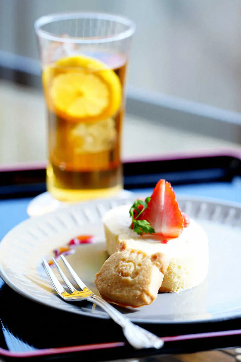 <第72期ALSOK杯王将戦 第5局第1日>藤井王将。午後のおやつ。米粉ロールケーキ&藻塩クッキーとアイスレモンティー(撮影・河野 光希)