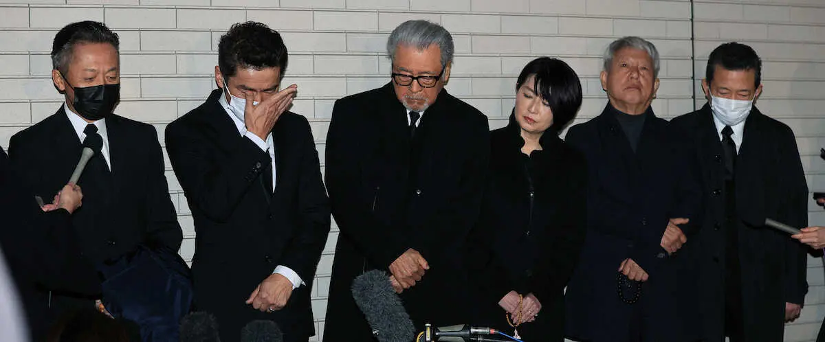 <笑福亭笑瓶さん通夜>囲み取材を受ける噂の!東京マガジンの共演者(左から)風見しんご、深沢邦之、森本毅郎、小島奈津子、清水国明、山口良一(撮影・久冨木 修)